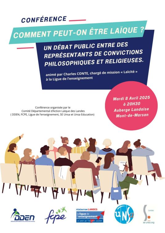 Ce débat public, organisé par le CDAL des Landes (Ligue de l’enseignement, FCPE, DDEN, UNSA éducation, SE UNSA), explorera la diversité des visions de la laïcité républicaine dans un esprit d’échange et de respect mutuel.