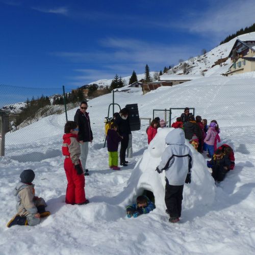 Raquettes, sculpture sur neige, construction d’igloo, jeu de recherche de personnes sous la neige avec ARVA (Appareil de Recherche de Victime d’Avalanche).