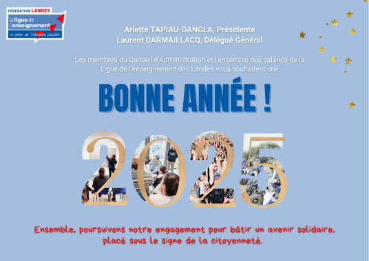 Je vous souhaite beaucoup d'enthousiasme pour qu’ensemble en 2025 nous continuions, par nos initiatives respectives et communes, à faire vivre, par votre engagement, les idéaux de laïcité, de fraternité et de solidarité que nous partageons et qui nous sont chers.